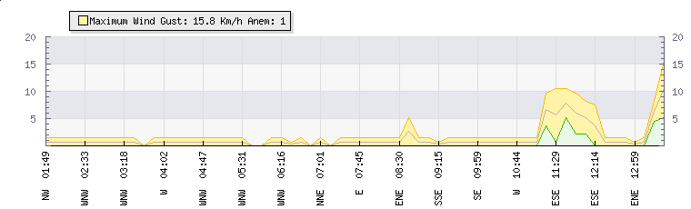 In the last few minutes the wind was Easterly at an average speed of 19 kmh, reaching up to 26 kmh and a low of 12 kmh. The gust strength is14 kmh above the minimum speed |