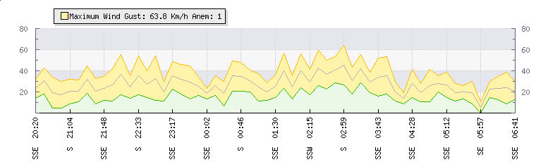 In the last few minutes the wind was South South East at an average speed of 27 kmh, reaching up to 39 kmh and a low of 15 kmh. The gust strength is24 kmh above the minimum speed |