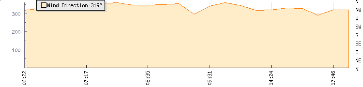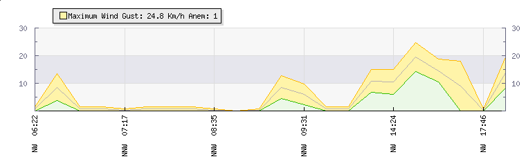 In the last few minutes the wind was North Westerly at an average speed of 11 kmh, reaching up to 15 kmh and a low of 6 kmh. The gust strength is9 kmh above the minimum speed |