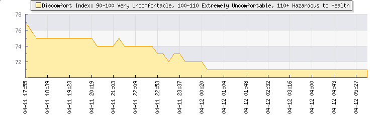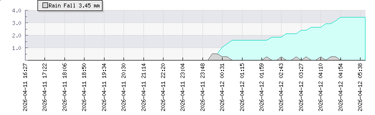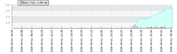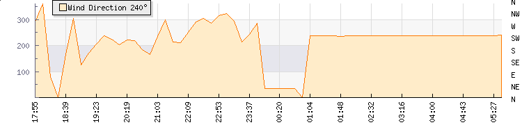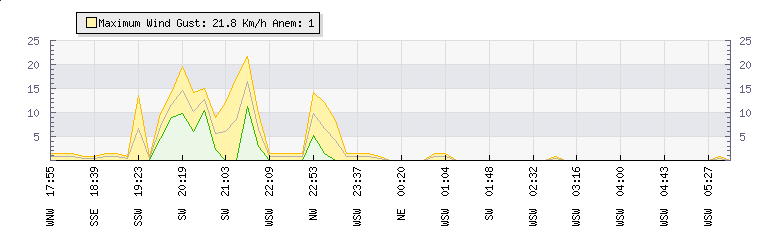 In the last few minutes the wind was West South West at an average speed of 0 kmh, reaching up to 0 kmh and a low of 0 kmh. The gust strength is0 kmh above the minimum speed |