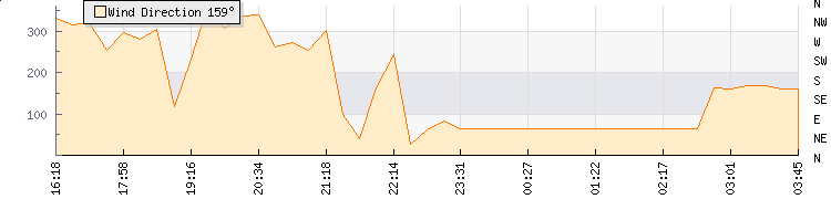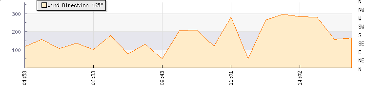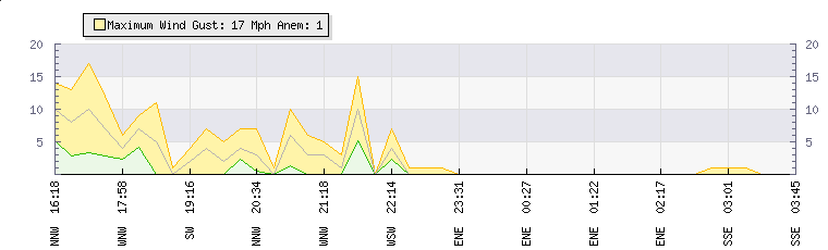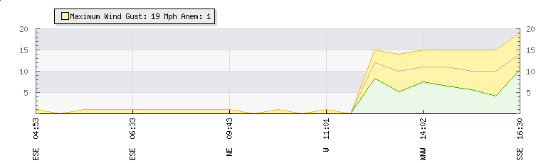 In the last few minutes the wind was Westerly at an average speed of 12 mph, reaching up to 15 mph and a low of 8 mph. The gust strength is7 mph above the minimum speed |