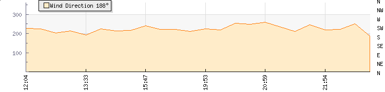 In the last few minutes the wind was South South West at an average speed of 10 mph, reaching up to 14 mph and a low of 7 mph. The gust strength is7 mph above the minimum speed |