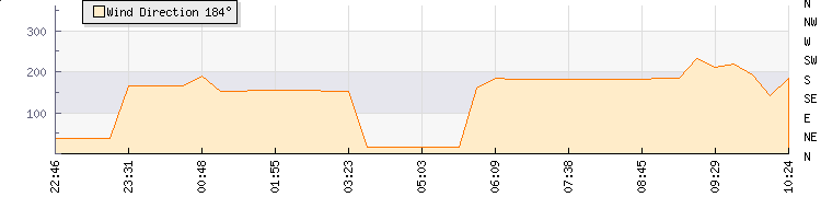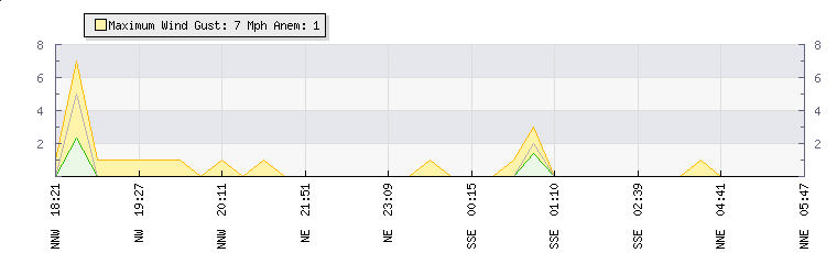 In the last few minutes the wind was South South East at an average speed of 0 mph, reaching up to 0 mph and a low of 0 mph. The gust strength is0 mph above the minimum speed |