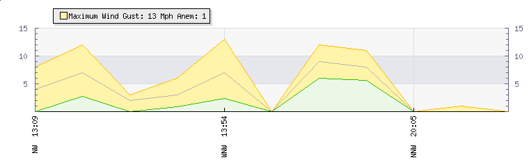 In the last few minutes the wind was North North West at an average speed of 0 mph, reaching up to 0 mph and a low of 0 mph. The gust strength is0 mph above the minimum speed |