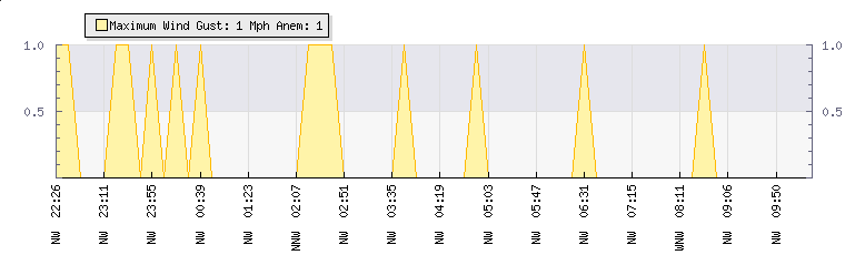 In the last few minutes the wind was North Westerly at an average speed of 0 mph, reaching up to 0 mph and a low of 0 mph. The gust strength is0 mph above the minimum speed |