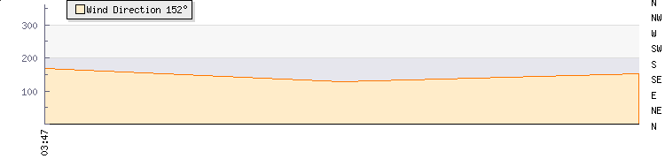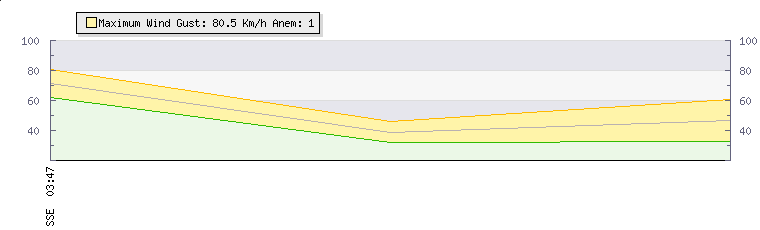 In the last few minutes the wind was South Easterly at an average speed of 39 kmh, reaching up to 46 kmh and a low of 32 kmh. The gust strength is14 kmh above the minimum speed |