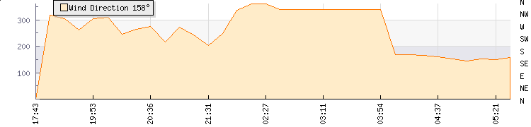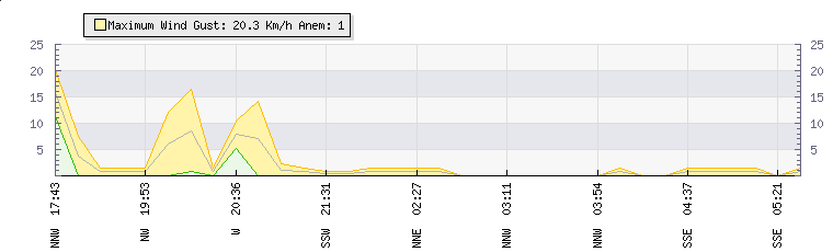 In the last few minutes the wind was North North West at an average speed of 0 kmh, reaching up to 0 kmh and a low of 0 kmh. The gust strength is0 kmh above the minimum speed |