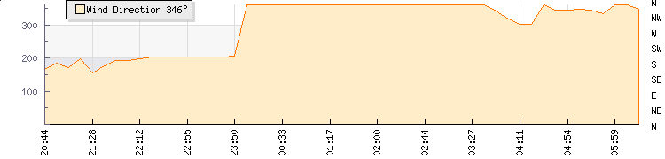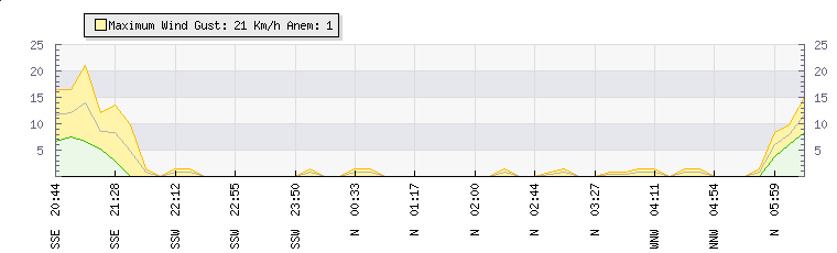 In the last few minutes the wind was North North West at an average speed of 1 kmh, reaching up to 2 kmh and a low of 0 kmh. The gust strength is2 kmh above the minimum speed |