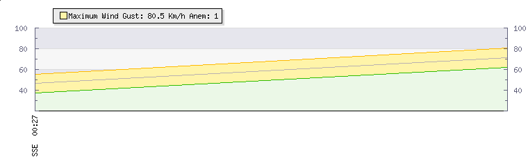 In the last few minutes the wind was South South East at an average speed of 71 kmh, reaching up to 81 kmh and a low of 62 kmh. The gust strength is19 kmh above the minimum speed |