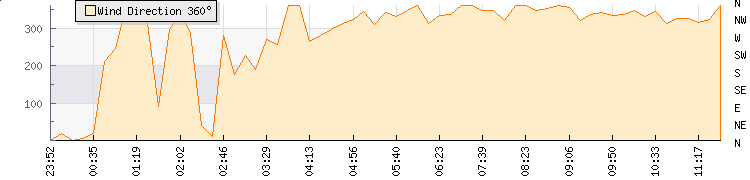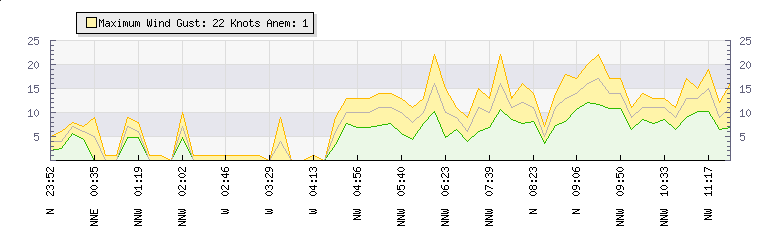 In the last few minutes the wind was Westerly at an average speed of 1 knots, reaching up to 1 knots and a low of 0 knots. The gust strength is1 knots above the minimum speed |