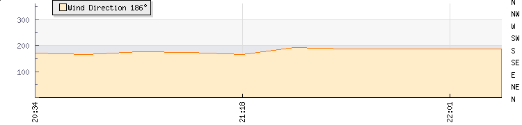In the last few minutes the wind was South South East at an average speed of 5 knots, reaching up to 9 knots and a low of 2 knots. The gust strength is7 knots above the minimum speed |