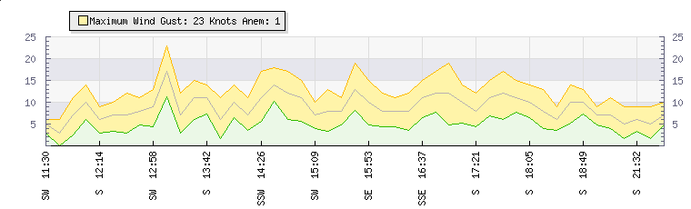 In the last few minutes the wind was South South East at an average speed of 7 knots, reaching up to 11 knots and a low of 4 knots. The gust strength is7 knots above the minimum speed |
