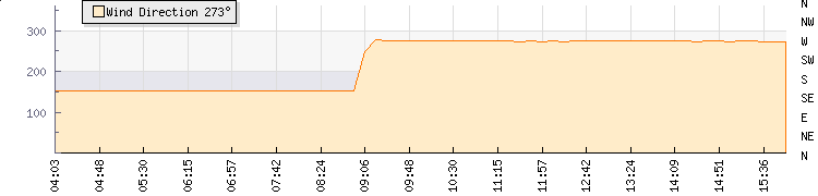 In the last few minutes the wind was Westerly at an average speed of 0 mph, reaching up to 0 mph and a low of 0 mph. The gust strength is0 mph above the minimum speed |