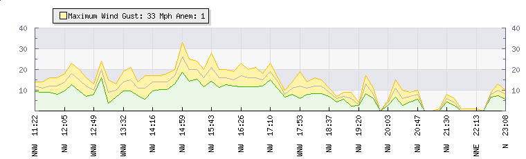In the last few minutes the wind was North Westerly at an average speed of 6 mph, reaching up to 7 mph and a low of 4 mph. The gust strength is3 mph above the minimum speed |