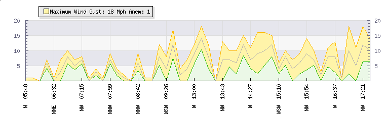 In the last few minutes the wind was North Westerly at an average speed of 9 mph, reaching up to 14 mph and a low of 4 mph. The gust strength is10 mph above the minimum speed |