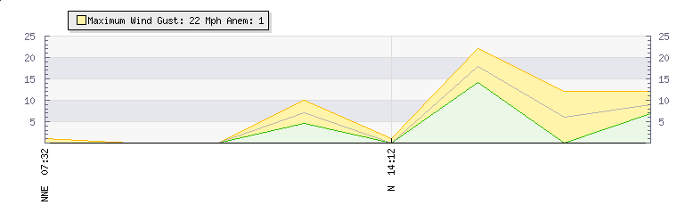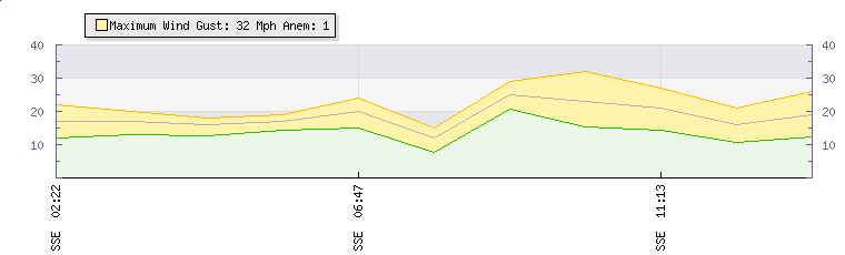 In the last few minutes the wind was South South East at an average speed of 21 mph, reaching up to 27 mph and a low of 14 mph. The gust strength is13 mph above the minimum speed |