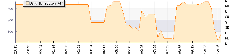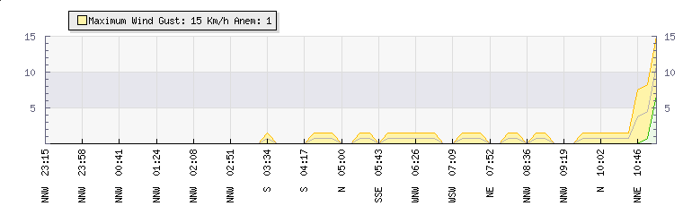 In the last few minutes the wind was North North West at an average speed of 0 kmh, reaching up to 0 kmh and a low of 0 kmh. The gust strength is0 kmh above the minimum speed |