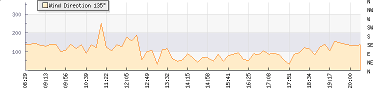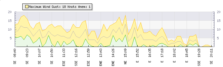 In the last few minutes the wind was South South East at an average speed of 6 knots, reaching up to 11 knots and a low of 0 knots. The gust strength is11 knots above the minimum speed |