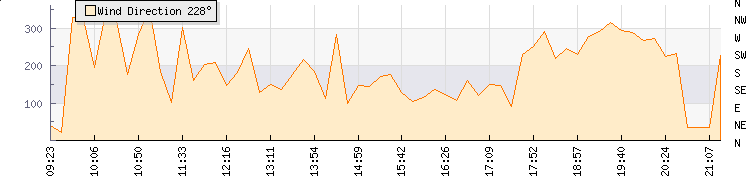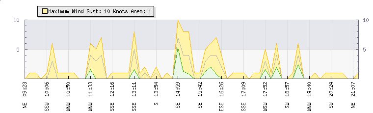In the last few minutes the wind was West North West at an average speed of 1 knots, reaching up to 1 knots and a low of 0 knots. The gust strength is1 knots above the minimum speed |