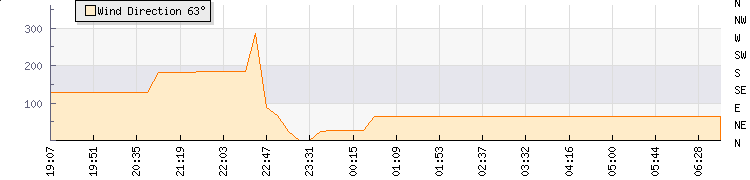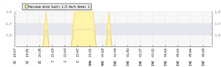 In the last few minutes the wind was East North East at an average speed of 0 kmh, reaching up to 0 kmh and a low of 0 kmh. The gust strength is0 kmh above the minimum speed |