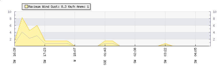 In the last few minutes the wind was South Westerly at an average speed of 0 kmh, reaching up to 0 kmh and a low of 0 kmh. The gust strength is0 kmh above the minimum speed |
