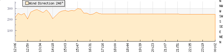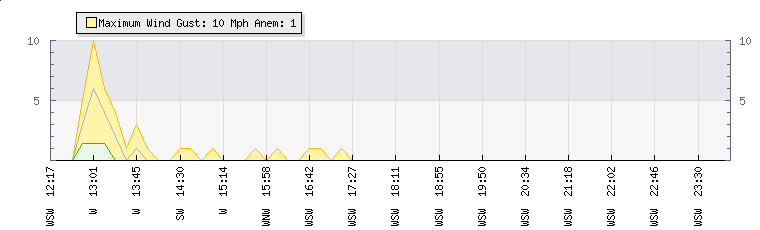 In the last few minutes the wind was West South West at an average speed of 0 mph, reaching up to 0 mph and a low of 0 mph. The gust strength is0 mph above the minimum speed |