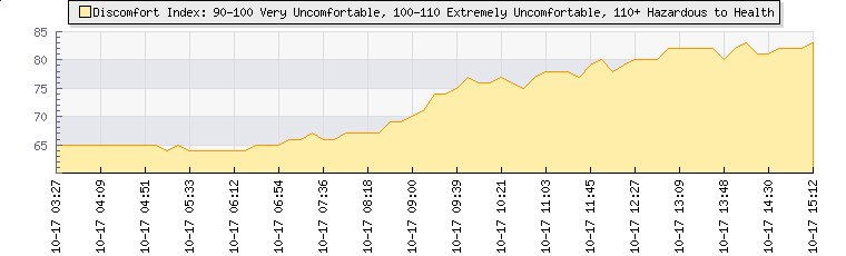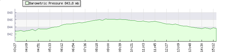 Wind Speed: | 26|33|41 kmh | Wind Direction: | SSW 200° | Temperature: | 22.2°C | Wet Bulb: | 17°C | Discomfort: | 82 | Humidity: | 60% | Rainfall Today: | 0mm | 12 hrs Rainfall: | 0mm | 24 hrs Rainfall: | 0mm | Barometer: | 844.5mb | Dew Point: | 14.1°C | Clouds AGL: | 3257ft (993 m) | Density-Alt: | 13517ft (4120 m) | Fire Danger: | |