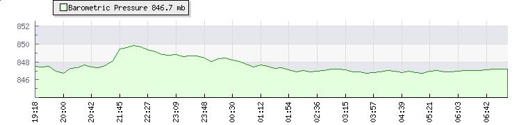 Wind Speed: | 14|18|22 kmh | Wind Direction: | SSE 168° | Temperature: | 16.2°C | Wet Bulb: | 11.4°C | Discomfort: | 66 | Humidity: | 59% | Rainfall Today: | 1.6mm | 12 hrs Rainfall: | 1.6mm | 24 hrs Rainfall: | 1.6mm | Barometer: | 848.6mb | Dew Point: | 8.1°C | Clouds AGL: | 3208ft (978 m) | Density-Alt: | 12621ft (3847 m) | Fire Danger: | |