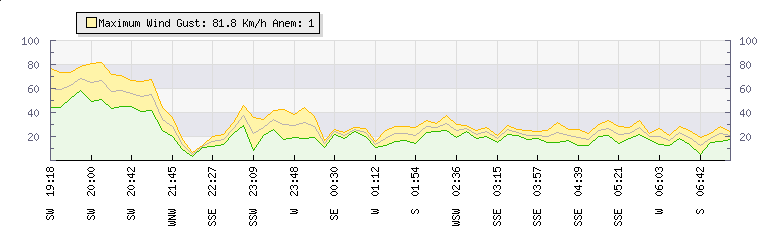 Wind Gust: | 82 km/h | Min Temp: | 11 °C | Max Temp: | 29.3 °C | Wind Average: | 69 km/h | Min Hum: | 29 % | Max Hum: | 87 % | |  |