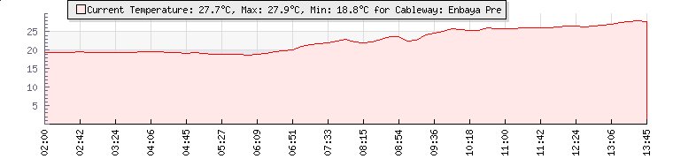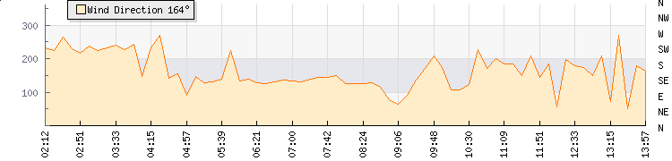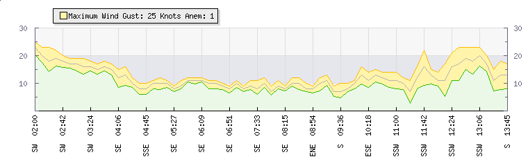 Wind Gust: | 32 knots | Min Temp: | 18.8 °C | Max Temp: | 26 °C | Wind Average: | 29 knots | Min Hum: | 40 % | Max Hum: | 54 % | |  |