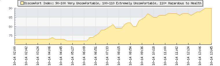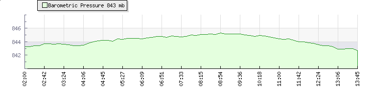 Wind Speed: | 10|12|14 knots | Wind Direction: | SW 228° | Temperature: | 26°C | Wet Bulb: | 17.2°C | Discomfort: | 86 | Humidity: | 40% | Rainfall Today: | 0mm | 12 hrs Rainfall: | 0mm | 24 hrs Rainfall: | 0mm | Barometer: | 845.1mb | Dew Point: | 11.3°C | Clouds AGL: | 5862ft (1787 m) | Density-Alt: | 13842ft (4219 m) | Fire Danger: | |