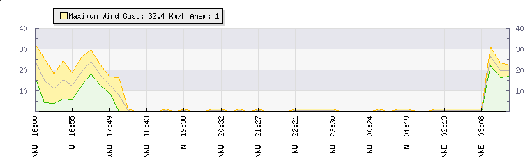 In the last few minutes the wind was South Westerly at an average speed of 23 kmh, reaching up to 32 kmh and a low of 14 kmh. The gust strength is18 kmh above the minimum speed |