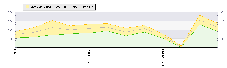 In the last few minutes the wind was North North West at an average speed of 15 kmh, reaching up to 18 kmh and a low of 13 kmh. The gust strength is5 kmh above the minimum speed |