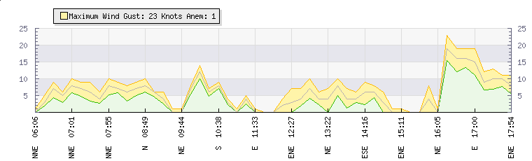 In the last few minutes the wind was North North East at an average speed of 6 knots, reaching up to 9 knots and a low of 3 knots. The gust strength is6 knots above the minimum speed |