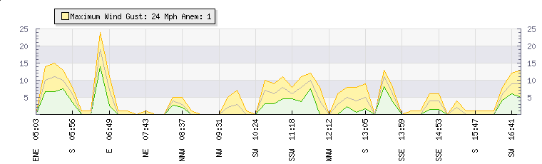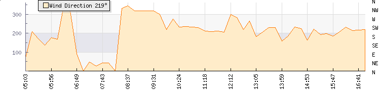 In the last few minutes the wind was South South West at an average speed of 1 mph, reaching up to 1 mph and a low of 0 mph. The gust strength is1 mph above the minimum speed |