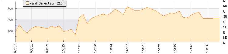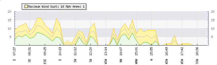 In the last few minutes the wind was South Westerly at an average speed of 3 mph, reaching up to 6 mph and a low of 0 mph. The gust strength is6 mph above the minimum speed |