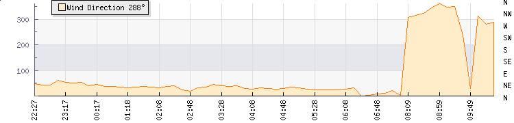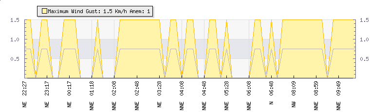 In the last few minutes the wind was North Easterly at an average speed of 0 kmh, reaching up to 0 kmh and a low of 0 kmh. The gust strength is0 kmh above the minimum speed |