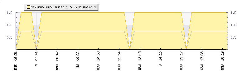 In the last few minutes the wind was South Westerly at an average speed of 1 kmh, reaching up to 2 kmh and a low of 0 kmh. The gust strength is2 kmh above the minimum speed |