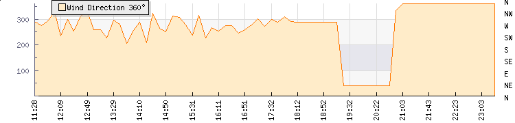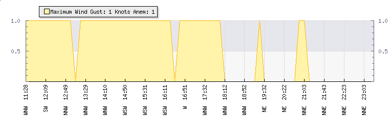 In the last few minutes the wind was North North East at an average speed of 0 knots, reaching up to 0 knots and a low of 0 knots. The gust strength is0 knots above the minimum speed |