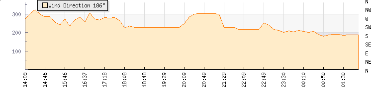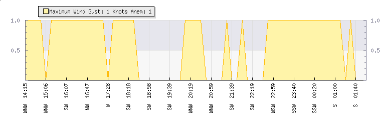 In the last few minutes the wind was South Westerly at an average speed of 0 knots, reaching up to 0 knots and a low of 0 knots. The gust strength is0 knots above the minimum speed |