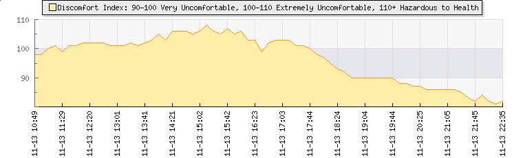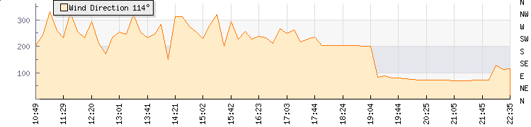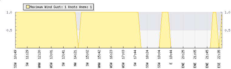 In the last few minutes the wind was East North East at an average speed of 0 knots, reaching up to 0 knots and a low of 0 knots. The gust strength is0 knots above the minimum speed |