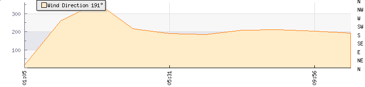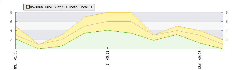 In the last few minutes the wind was South South West at an average speed of 3 knots, reaching up to 4 knots and a low of 1 knots. The gust strength is3 knots above the minimum speed |
