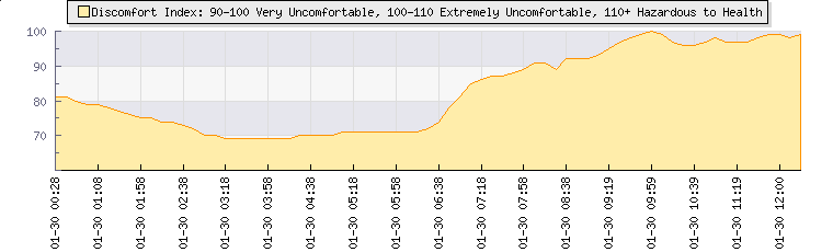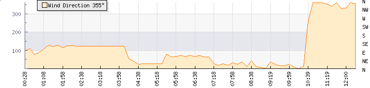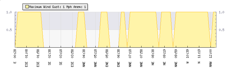 In the last few minutes the wind was Westerly at an average speed of 1 mph, reaching up to 1 mph and a low of 0 mph. The gust strength is1 mph above the minimum speed |