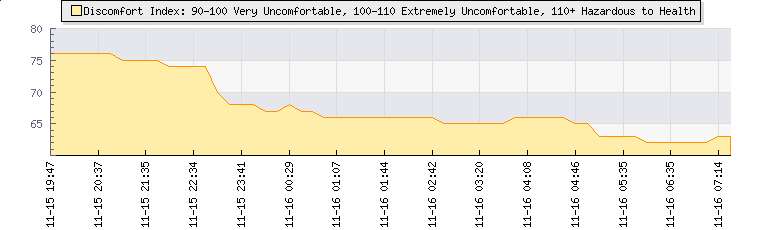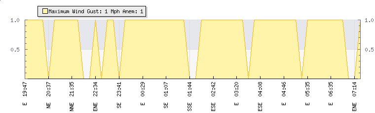 In the last few minutes the wind was East North East at an average speed of 1 mph, reaching up to 1 mph and a low of 0 mph. The gust strength is1 mph above the minimum speed |