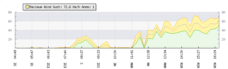 In the last few minutes the wind was East North East at an average speed of 5 kmh, reaching up to 9 kmh and a low of 0 kmh. The gust strength is9 kmh above the minimum speed |