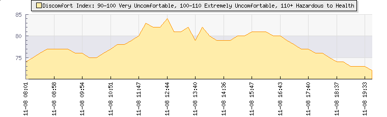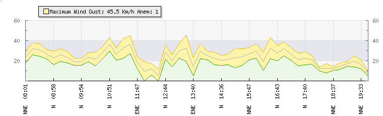 In the last few minutes the wind was Northerly at an average speed of 23 kmh, reaching up to 29 kmh and a low of 16 kmh. The gust strength is13 kmh above the minimum speed |