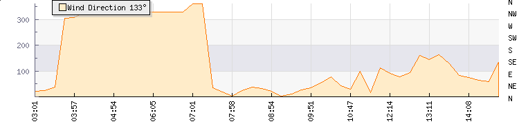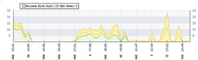 In the last few minutes the wind was Easterly at an average speed of 1 mph, reaching up to 1 mph and a low of 0 mph. The gust strength is1 mph above the minimum speed |