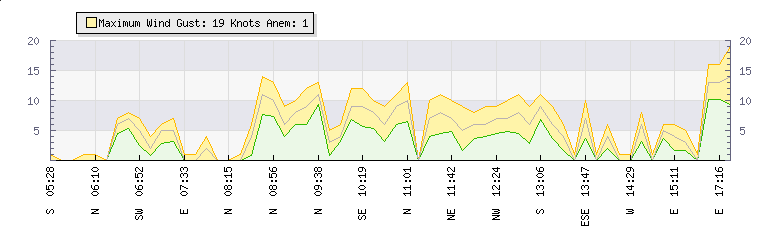 In the last few minutes the wind was South South West at an average speed of 1 knots, reaching up to 1 knots and a low of 0 knots. The gust strength is1 knots above the minimum speed |