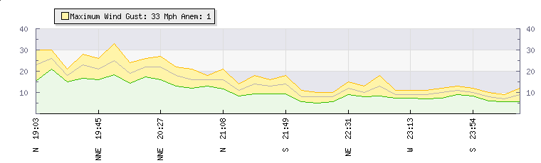 In the last few minutes the wind was Northerly at an average speed of 9 mph, reaching up to 11 mph and a low of 7 mph. The gust strength is4 mph above the minimum speed |