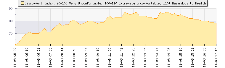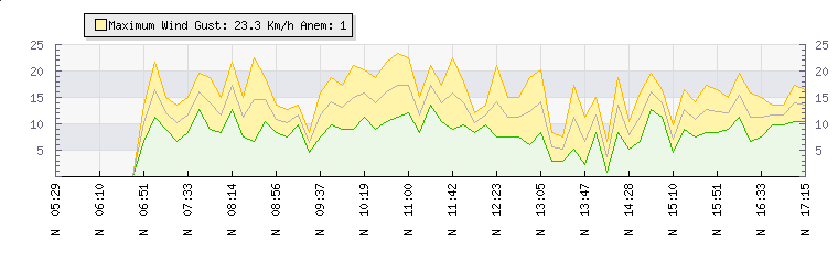 In the last few minutes the wind was Northerly at an average speed of 14 kmh, reaching up to 17 kmh and a low of 11 kmh. The gust strength is6 kmh above the minimum speed |
